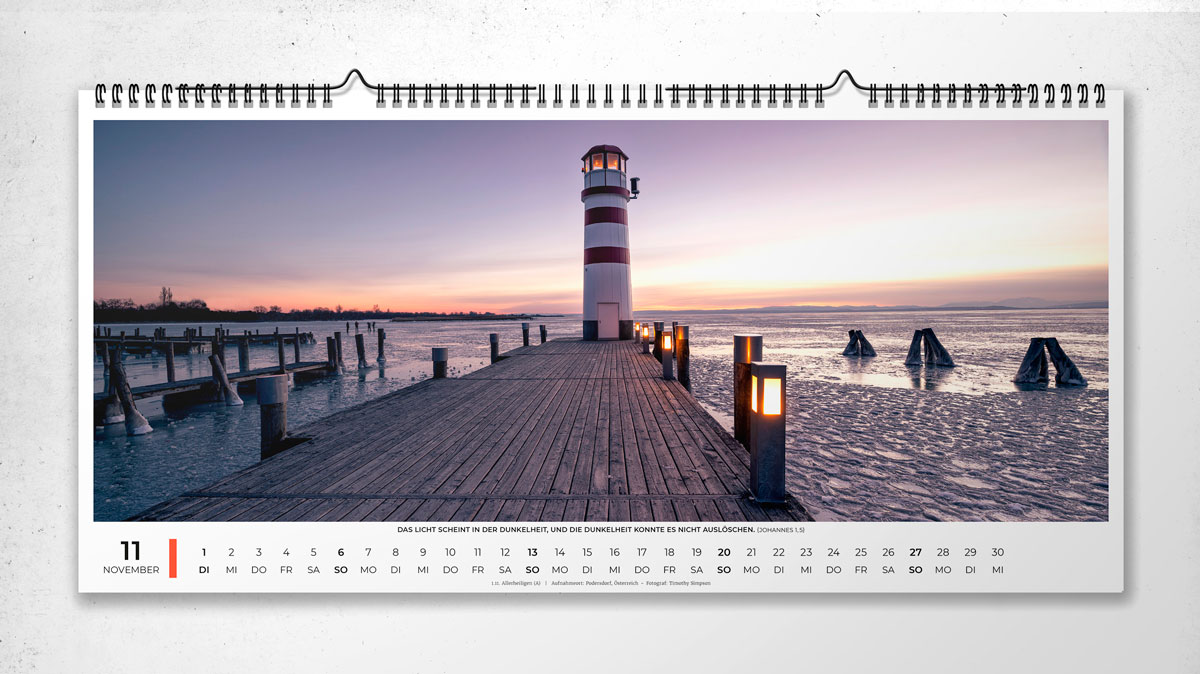Am Ende des Kalenders wird erklärt, wie man eine Beziehung zu Gott bekommt. Der Panoramakalender hat eine Spiralbindung und zwei Aufhänger. Jedes Monatsbild ist mit Kalendarium, Kalenderwochen und Feiertagen versehen.